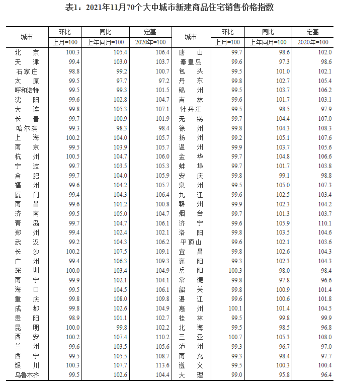 12月15日上午,国家统计局发布70个大中城市商品住宅销售价格变动情况,数据显示,11月70个大中城市商品住宅销售价格环比延续下降态势,同比涨幅持续回落。