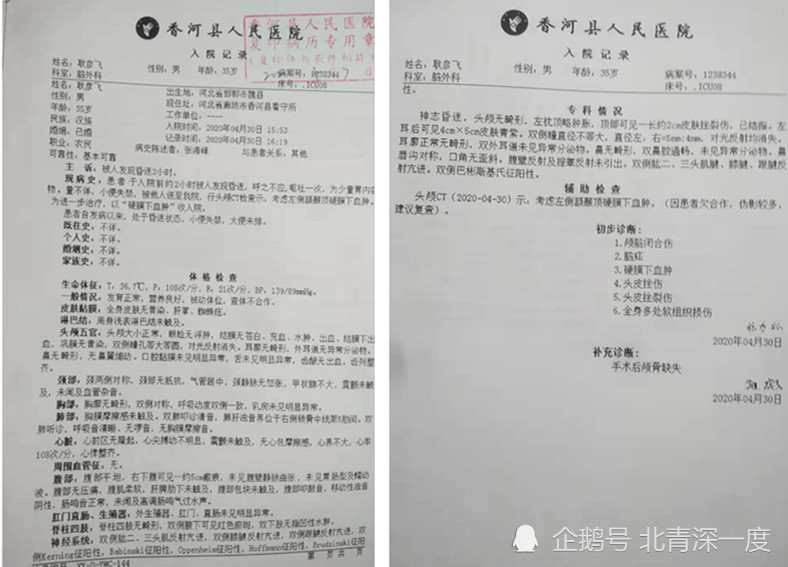 医院记录显示,耿彦飞入院时已神志昏迷,两侧瞳直径不等大,对光反射消失。初步诊断为颅脑闭合伤、脑疝、硬膜下血肿、头皮挫伤、头皮挫裂伤、全身多处软组织损伤。接诊医生在证言中表示,耿彦飞头部有大约2厘米长的裂伤口,右耳部有青紫伤,头部两个外伤由外力打击造成。