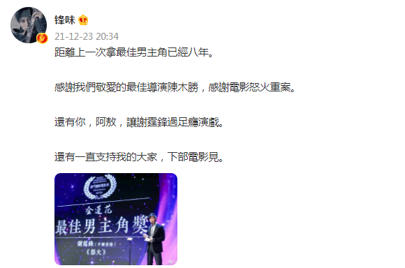 谢霆锋随后在社交平台发文,称:“距离上一次拿最佳男主角已经八年。感谢我们敬爱的最佳导演陈木胜,感谢电影怒火重案。还有你,阿敖,让谢霆锋过足瘾演戏。还有一直支持我的大家,下部电影见。”