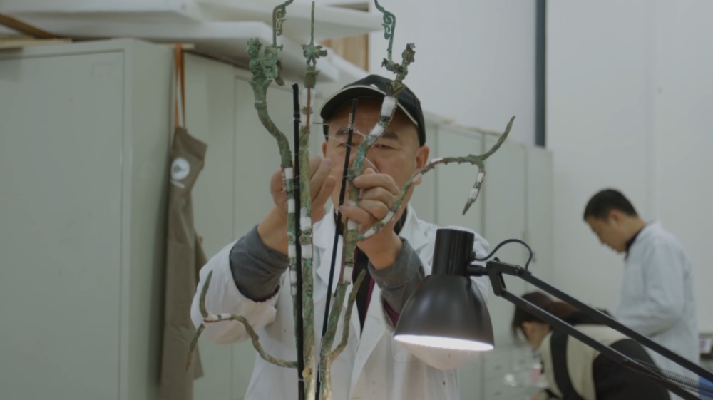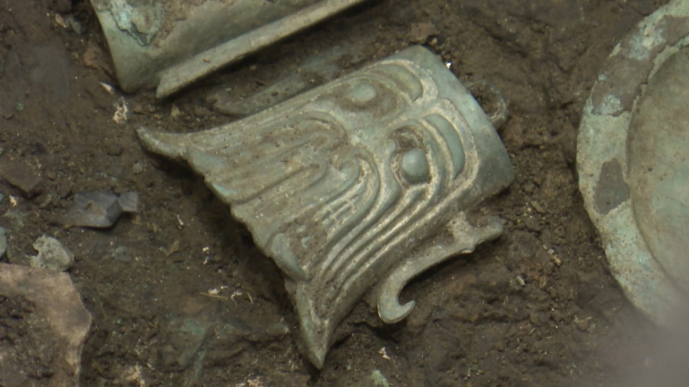 三星堆遗址祭祀区考古工作队 黎海超:铜铃数量尤其多,现在可能发现有十几件二十件的样子。虽然说7号坑器物普遍都偏小,但是其实新的器型还比较多,比如说我们发现了有一些三角形的,像一个小帽子一样的,像小跳棋一样的那种,现在不知道是什么样功用的一些小的铜器。