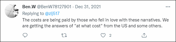 这条推文受到中外网民热议。一位网民回答:“爱上这些故事的人正在付出代价,我们从美国和其他一些国家那儿看到了‘代价是什么’的答案。”