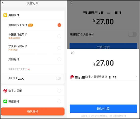 中新财经分别用数字人民币支付了美团、饿了么的订单,使用方式与电子支付工具相似。首先为数字钱包充钱,目前有两种方式:从手机银行转入、银行卡充钱,然后将美团、饿了么添加进子钱包进行授权,之后打开美团、饿了么正常下单,在“选择付款方式”处选择数字人民币子钱包,即可完成数字人民币线上支付。