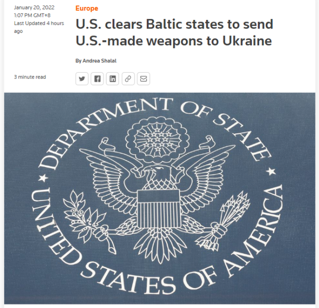据路透社20日报道,据三名知情人士透露,美国国务院已经批准立陶宛、拉脱维亚和爱沙尼亚向乌克兰运送美国制造的导弹和其他武器。与此同时,美国总统拜登预测俄罗斯将“进入”(move in)乌克兰。