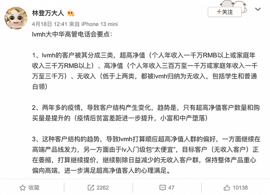 近日微博上流传的一份“LVMH大中华高管电话会要点”称,为了应对中国消费者分化加大,未来LVMH的客户将被分为“超高净值”、“高净值”和“无收入”三类。而产品结构方面,将重点关注高端产品线,通过提高售价来过滤消费者。