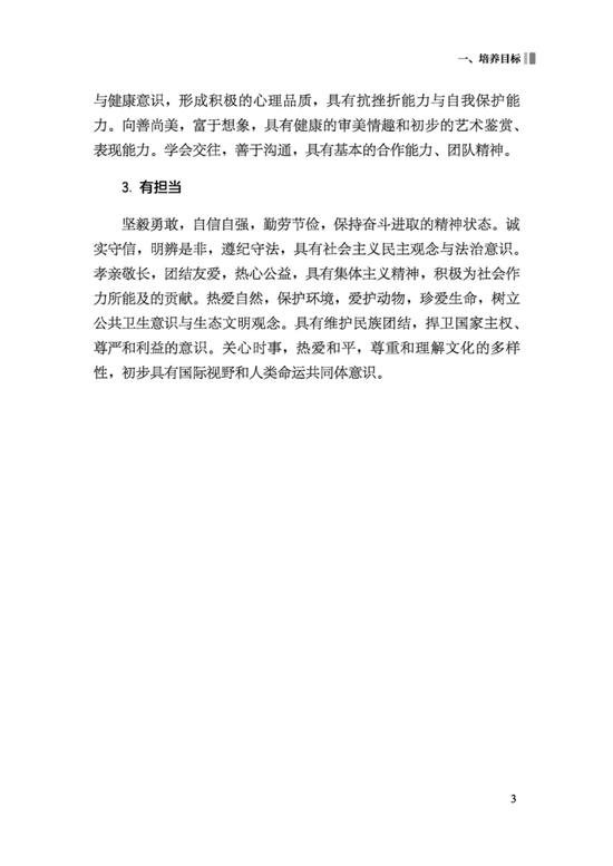 各门课程基于培养目标,将党的教育方针具体化细化为学生核心素养发展要求,明确本课程应着力培养的正确价值观、必备品格和关键能力。进一步优化了课程设置,九年一体化设计,注重幼小衔接、小学初中衔接,独立设置劳动课程。与时俱进,更新课程内容,改进课程内容组织与呈现形式,注重学科内知识关联、学科间关联。结合课程内容,依据核心素养发展水平,提出学业质量标准,引导和帮助教师把握教学深度与广度。通过增加学业要求、教学提示、评价案例等,增强了指导性。
