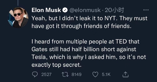 马斯克在Twitter上说:“我听很多人说,盖茨还持有5亿美元特斯拉的空头头寸,这就是我问他的原因,所以这并不是最高机密。”