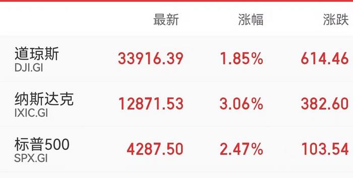中新财经4月29日电 美东时间4月28日,美股三大股指全面上涨。截至收盘,道指涨1.85%报33916.39点;标普500指数涨2.47%报4287.50点;纳指涨3.06%报12871.53点。大型科技股纷纷上涨,facebook母公司Meta收涨17.59%,高通涨逾9%,英伟达涨逾7%,奈飞涨逾5%,亚马逊、苹果涨超4%。