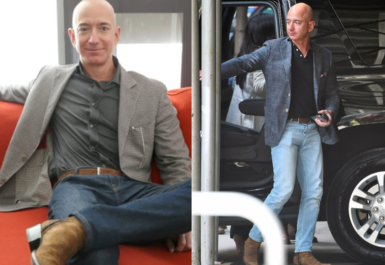 这几年越来越回春的贝佐斯,还喜欢穿鹿皮靴子搭配牛仔裤和休闲西装,来突出自己狂野性感的一面。