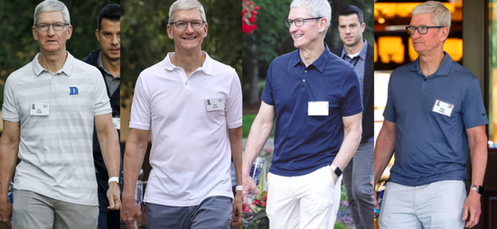 当然啦,毕竟是当年富豪人手一件的单品,新贵里也不乏Polo衫爱好者,库克参加太阳谷峰会的时候,就把蓝白色系Polo衫穿了个遍↓