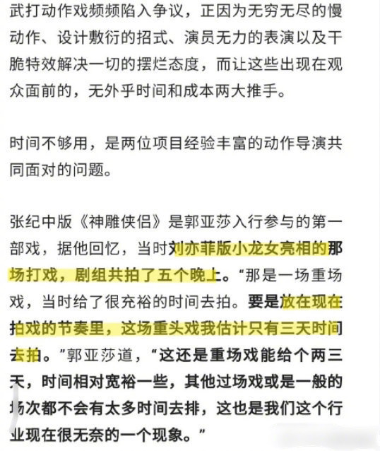 新浪娱乐讯 《神雕侠侣》的动作导演郭亚莎在接受采访时表示,当初刘亦菲版小龙女亮相的那场打戏,剧组总共拍了五个晚上;要是放在现在,这种重头戏估计只有三天时间。