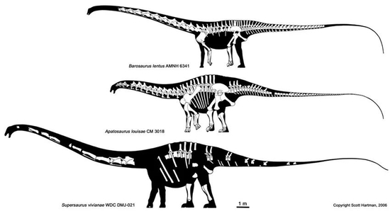 说完了重龙,再来说说超龙。超龙与重龙一样属于梁龙科,它的化石在发现的时候就非常震撼,仅仅是一块肩胛骨(编号:BYU 9025)的高度就有2.4米高。在超龙刚被命名的时候,古生物学家认为其体长在40至45米之间,但后来缩水到了35米。