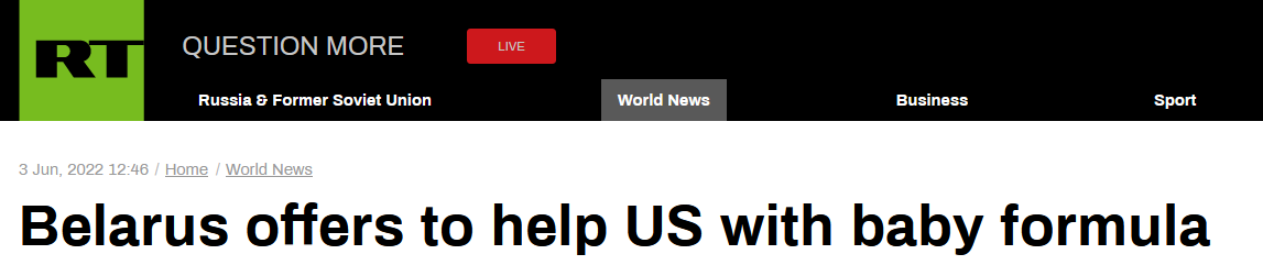 (观察者网讯)据“今日俄罗斯”(RT)当地时间3日报道,白俄罗斯总统亚历山大·卢卡申科当天表示,该国愿意以人道主义援助等方式向美国提供婴儿配方奶粉和其他婴儿食品,以缓解全美多地现阶段正面临的“奶粉荒”。