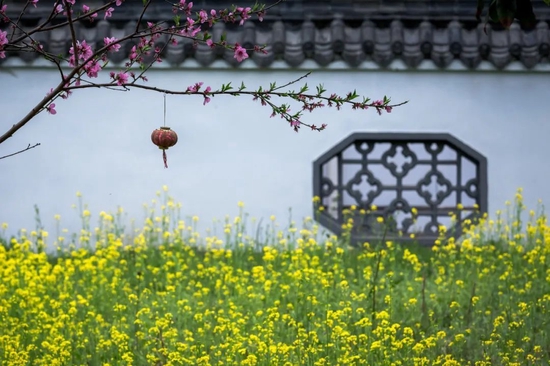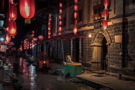 左边,是青砖白瓦;右边,是古朴暗红,还有大红灯笼随风飘荡。