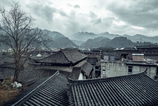 清晨,青木川云雾缭绕,远处群山叠峦,雾霭缭绕,近处屋顶上青瓦鳞次节比。