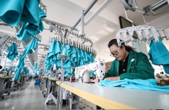 工人在葫芦岛益丰(集团)运动服饰有限公司生产车间加工泳衣(新华社发)