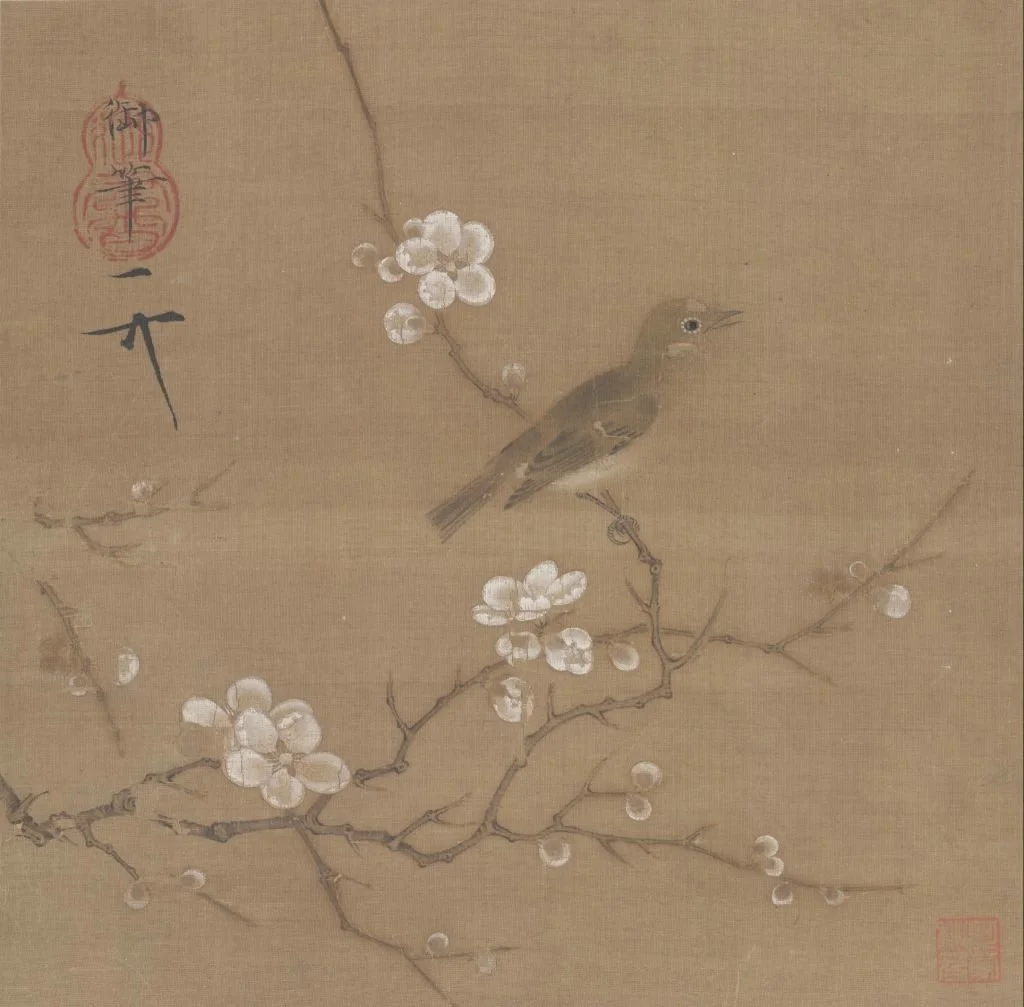 图中梅枝瘦劲,枝上疏花秀蕊,一只绣眼俏立枝头,鸣叫顾盼,与清丽的梅花相映成趣。此图虽然景物不多,却颇为优美动人。所绘梅花为宫梅,经过不断剪枝,人工修饰痕迹较重。此种梅的画法精细纤巧,敷色厚重,自有一种富贵气息,这样的风格趣味为宫廷所好尚,显然代表了皇家的审美意味。