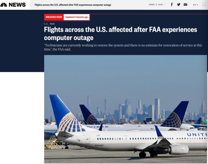 “由于空中任务通知系统‘失灵’,整个美国空中系统都受到影响,”FAA在其官网通知中写道。“技术人员目前正在努力恢复系统。”