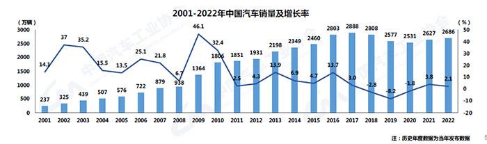 中汽协数据显示,2022年,中国汽车产销分别完成2702.1万辆和2686.4万辆,同比分别增长3.4%和2.1%。与2021年相比,产量增速持平,销量增速下降1.7个百分点。我国汽车产销总量已经连续14年稳居全球第一。