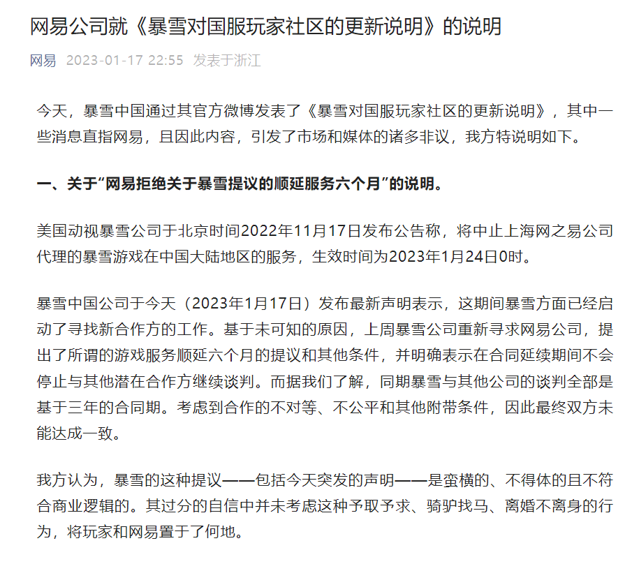 红星资本局消息,1月17日深夜,网易官方发布声明回应“网易拒绝关于暴雪提议的顺延服务六个月”一事,称“基于未可知的原因,上周暴雪公司重新寻求网易公司,提出了所谓的游戏服务顺延六个月的提议和其他条件,并明确表示在合同延续期间不会停止与其他潜在合作方继续谈判。而据我们了解,同期暴雪与其他公司的谈判全部是基于三年的合同期。考虑到合作的不对等、不公平和其他附带条件,因此最终双方未能达成一致。”