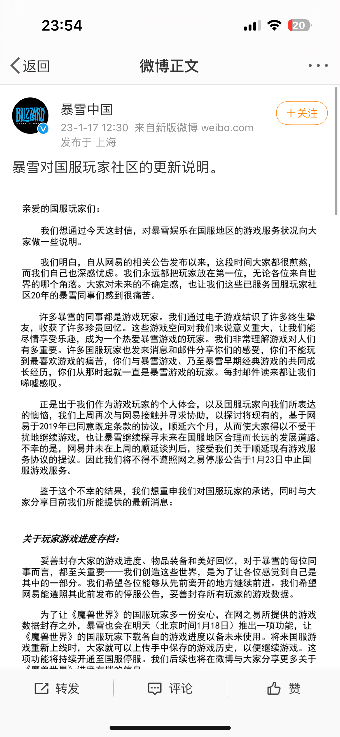 红星资本局了解到,1月17日午间,暴雪中国官方微博发文称,上周再次与网易接触并寻求协助,以探讨将现有的,基于网易于2019年已同意既定条款的协议,顺延六个月。但网易并未在上周的顺延谈判后,接受其关于顺延现有游戏服务协议的提议。因此暴雪将遵照网之易停服公告于1月23日中止国服游戏服务。
