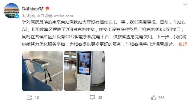 高铁站大厅没有插座充电?车站回应:已摆放充电座椅