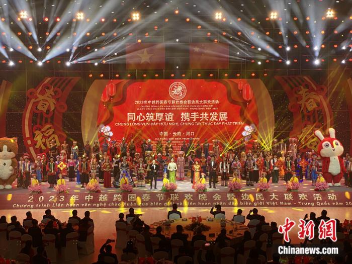 中新社云南红河1月19日电 (陈静)“祝大家兔年吉祥,猫年如意!”18日晚,随着中越两国主持人的响亮开场,2023年中越跨国春节联欢晚会暨边民大联欢活动在云南省红河州河口县拉开帷幕。这是新冠疫情发生以来,双方首次恢复举办跨国春晚。