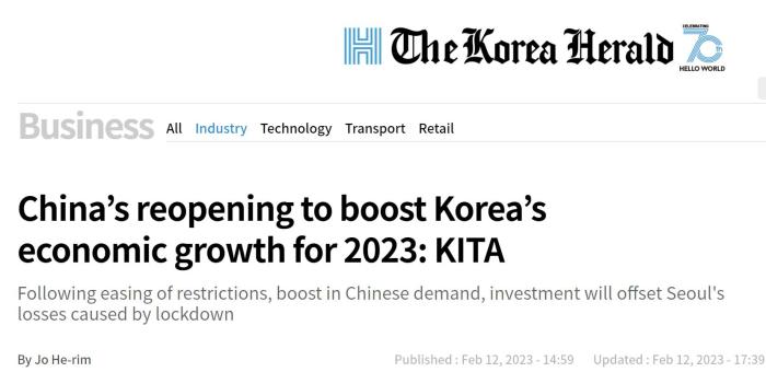 韩媒援引韩国贸易协会(KITA)国际贸易通商研究院12日发行的《中国经济重启对韩国经济影响分析报告》指出,中国经济若从2023年第二季度起全面反弹,对华依存度较高的韩国经济和出口形势有望好转。