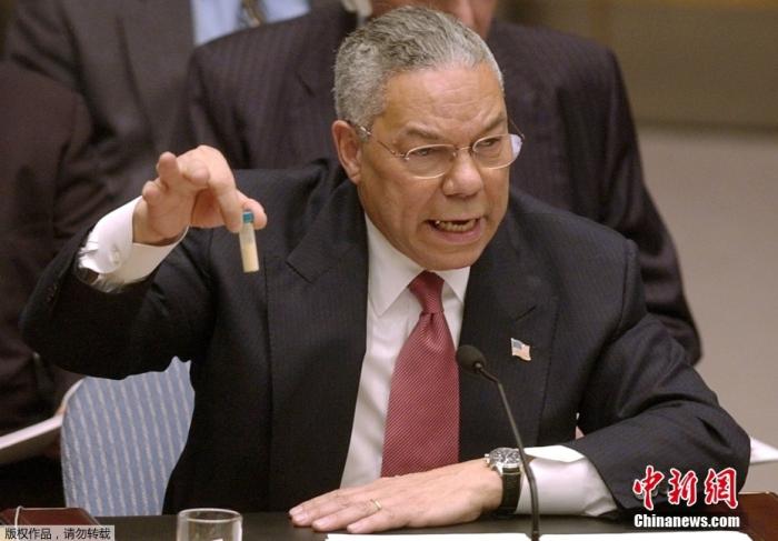 2003年2月5日,时任美国国务卿科林·鲍威尔在联合国安理会举起试管,作为指控伊拉克存在大规模杀伤性武器的证据。
