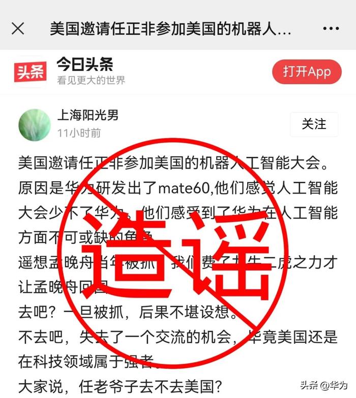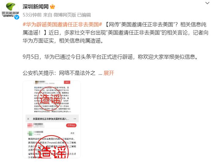 9月5日,华为发布消息:网传“美国邀请任正非去美国”等信息,纯属造谣!欢迎大家举报!