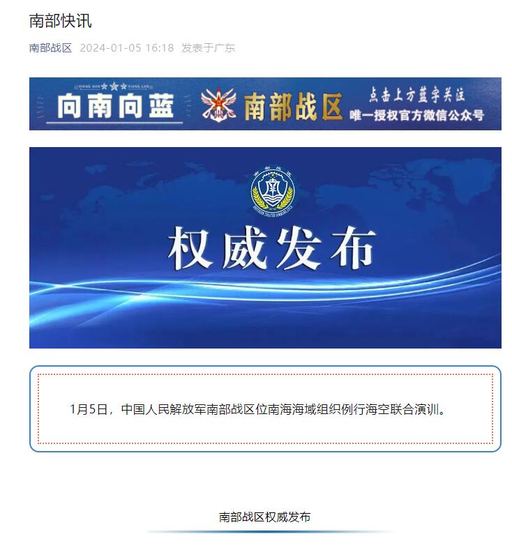南部战区微信公众号宣布,中国人民解放军南部战区位南海海域组织例行海空联合演训。但它没有透露演习地点和规模的细节。 3日和4日,美菲进行军演,“卡尔·文森”号航母为首的航母战斗群参加了演习,期间中国南部战区也进行了一次巡航。
