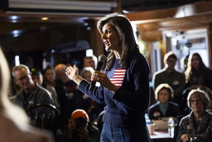 当地时间2024年1月9日,美国艾奥瓦州沃基,美国共和党总统候选人、美国前常驻联合国代表妮基·黑利参加竞选活动。图/IC photo