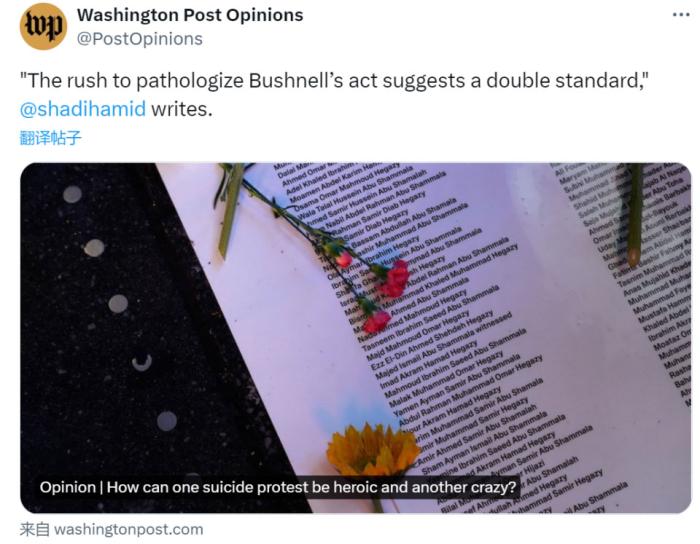 2月25日在以色列驻美大使馆门前自焚身亡以抗议美以在加沙进行种族灭绝的25岁现役美空军亚伦·布什内尔,以身证道,成了近期震惊世界的事件。关于这位义士的生平简介、抗议行动本身和以后的价值、意义,这两天想必各位也听了、看了不少了,今天乌鸦来谈谈这次自焚抗议事件发生后,也许更加值得细品的一些状况。