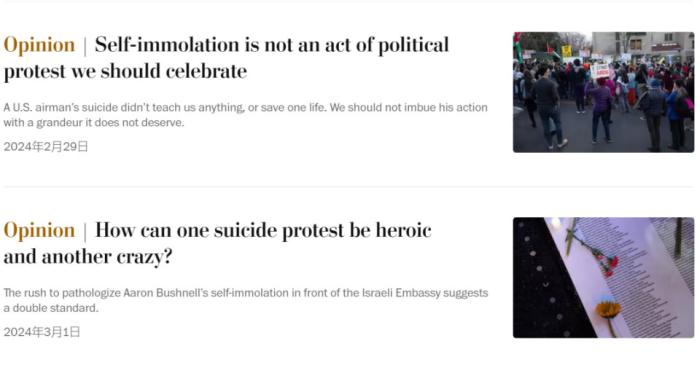 实际上,因为布什内尔在直播中的话有非常多的政治标签,标题想要体现自焚事件的原因本来是非常容易的。但在西方主流媒体的报道标题中,最能直观表明布什内尔行为原因的三个关键词——“加沙”(Gaza)“种族灭绝”(genocide)乃至“抗议”(protest)字样均未出现。