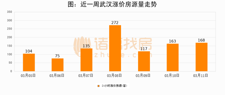 根据诸葛找房数据显示,武汉24小时涨价房源量为168套,较03月10日增加5套,环比上涨3.1%。与此同时,涨价房源占比小幅扩大,业主信心有所提升。