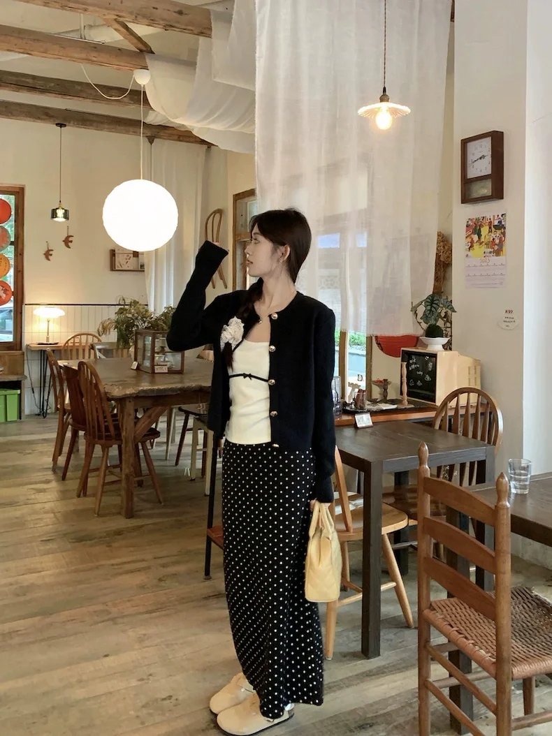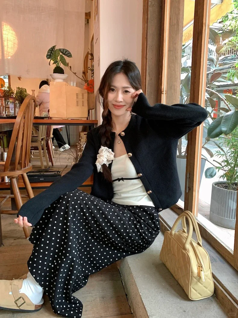 小香风针织开衫+吊带背心,下装配波点半身裙,整个有种韩系千金的感觉,精致又显瘦 春天这样穿好韩好温柔啊~