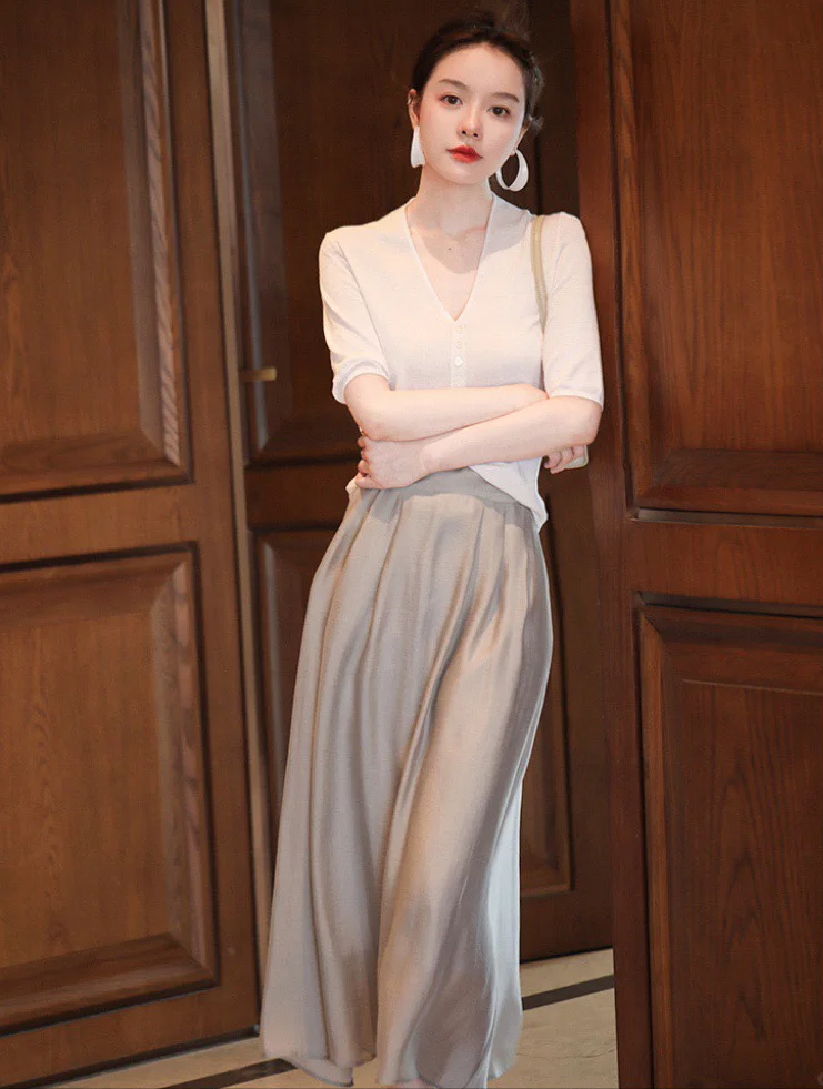 法式复古V领针织衫+高腰醋酸半身裙套,这一身穿搭造型太可了,展现出大女主的既视感,这很好的展现出时髦是优雅感,详细你也会喜欢。