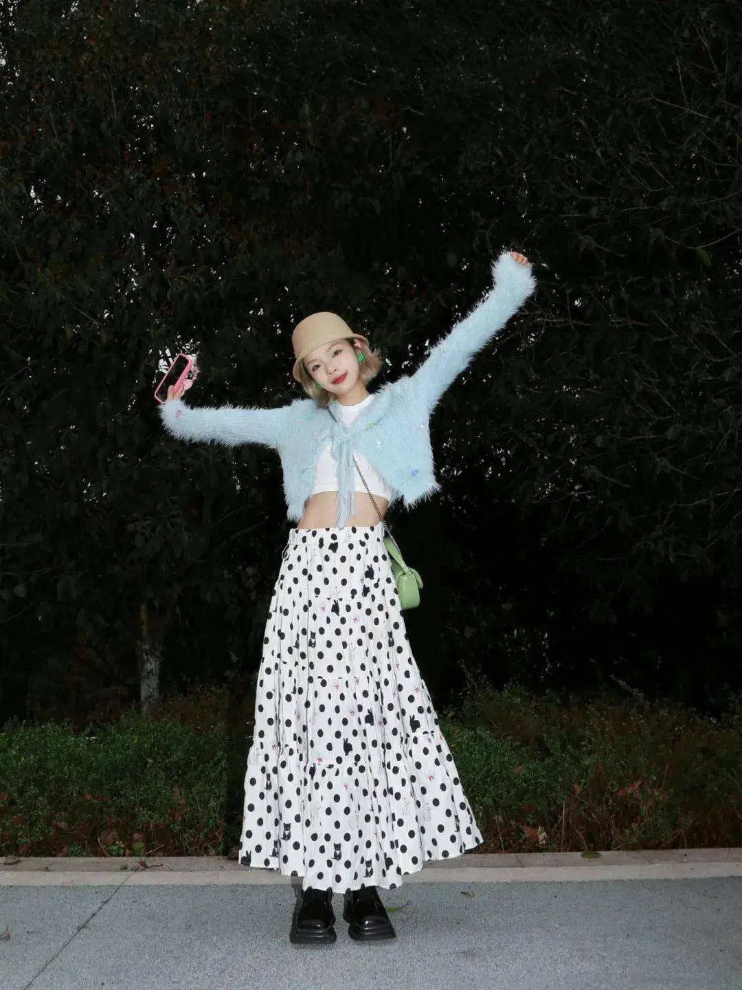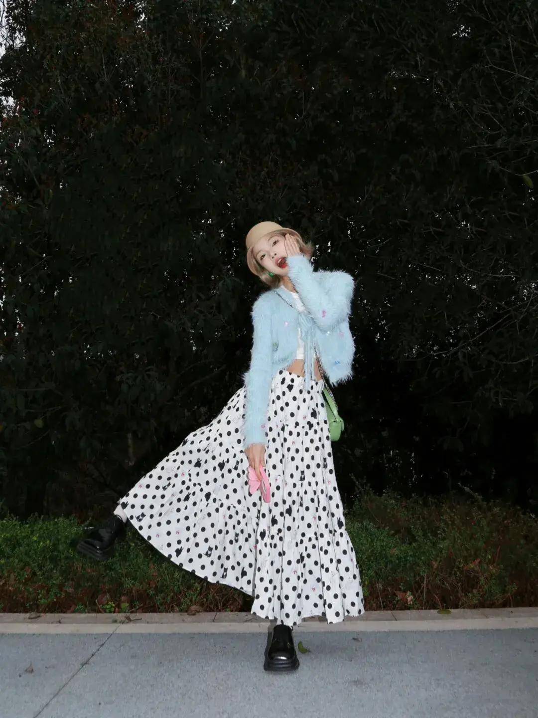 蓝色的短款针织衫温柔甜美,加上这一条白色的高腰波点,半身裙之后多了几分自由洒脱,浑身上下都散发着满满的活力感。