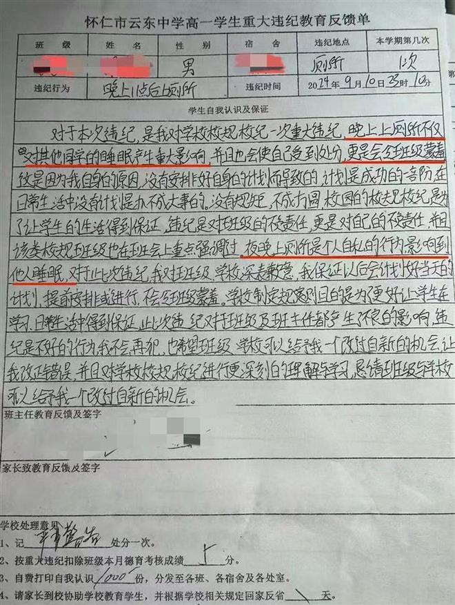 一份《怀仁市云东中学高一学生重大违纪教育反馈单》显示,该高一学生夜间上厕所一事发生在9月10日晚11时10分。该学生在自我认识中称:“晚上上厕所不仅对其他同学的睡眠产生重大影响……更是会令班级蒙羞。”“夜晚上厕所是个自私的行为,影响到他人睡眠。”