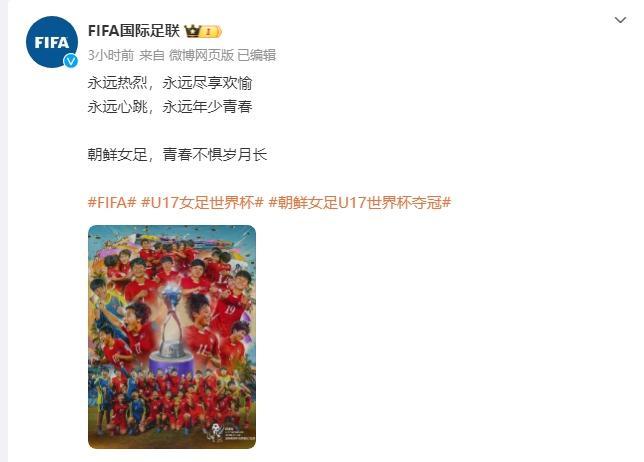 国际足联官方微博连发4条微博,恭喜朝鲜女足再次荣获世界冠军