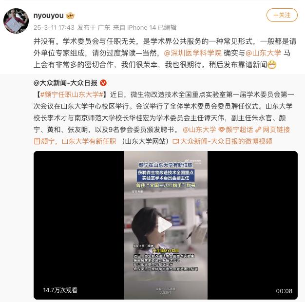3月11日,“颜宁任职山东大学”微博热度持续攀升。当日下午,颜宁个人微博转发相关新闻报道并发文称:“并没有。学术委员会与任职无关,是学术界公共服务的一种常见形式,一般都是请外单位专家组成,请勿过度解读。”