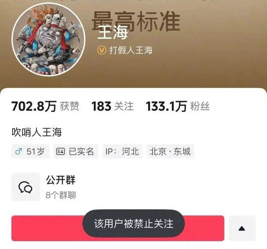 3月14日,记者搜索发现,职业打假人@王海 多账号被禁止关注。微博账号显示“该用户因违反法律法规或《微博社区公约》被禁止关注”,抖音账号显示“该用户被禁止关注”。