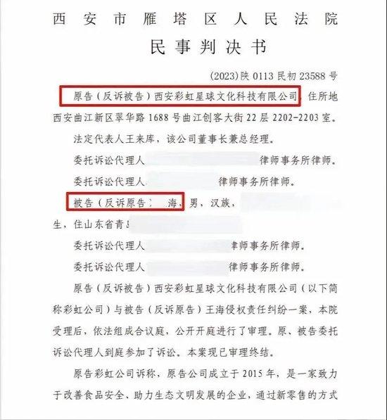 陕西省西安市雁塔区人民法院判定王海删除多平台侵犯彩虹星球名誉权的全部图文和视频内容并公开赔礼道歉,彩虹星球也需删除两条有关视频。