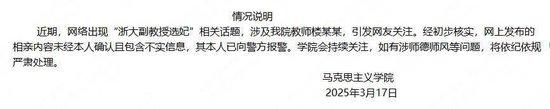 3月17日,九派新闻致电浙江大学马克思主义学院,询问此事后对方回复“不清楚”,随即挂断。浙江大学一工作人员表示今天关注到此事,正在核实中。