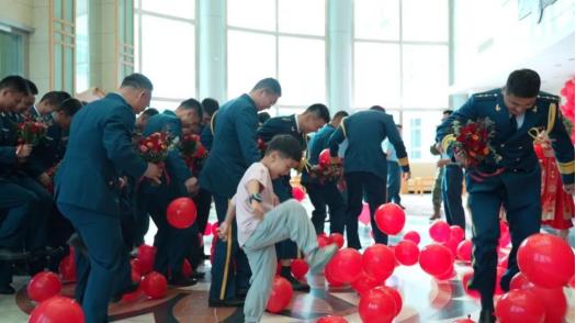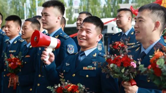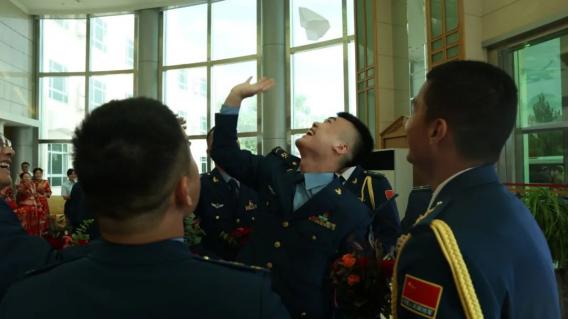 近日,空军某部礼堂前喜气洋洋