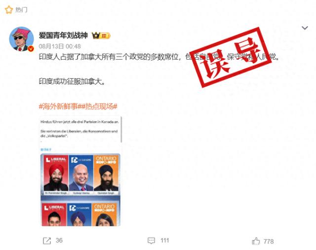 近日,社交平台流传一则消息称,“印度人占据了加拿大所有三个政党的多数席位,包括自由党、保守党和人民党”,并据此宣称“印度已经成功征服加拿大”。