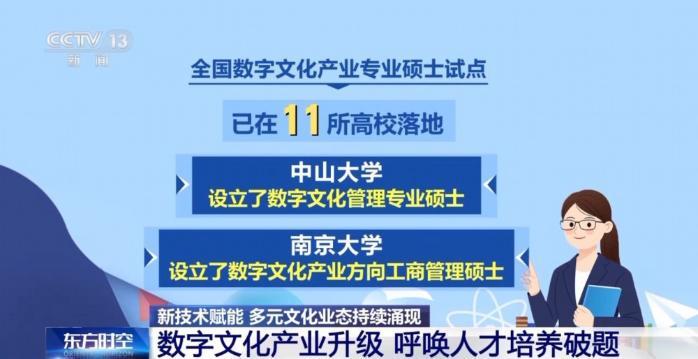 据了解,为推动数字文化产业发展,全国数字文化产业专业硕士试点已在11所高校落地。其中,中山大学设立了数字文化管理专业硕士,南京大学设立了数字文化产业方向工商管理硕士。为实现人才培养与产业需求无缝对接,部分院校还与企业开展深度合作,以企业项目为实操,定向培养懂创作、通技术的复合型人才。重庆城市职业学院就结合本地数字产业特点,与企业共建了虚拟现实技术应用、数字媒体技术等“订单班”。