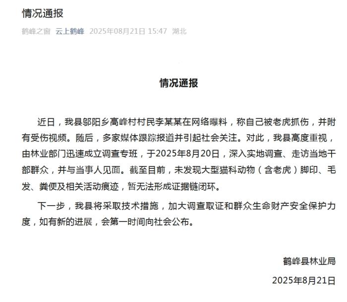 近日,鹤峰县邬阳乡高峰村村民李某某在网络曝料,称自己被老虎抓伤,并附有受伤视频。随后,多家媒体跟踪报道并引起社会关注。对此,鹤峰县高度重视,由林业部门迅速成立调查专班,于2025年8月20日,深入实地调查、走访当地干部群众,并与当事人见面。截至目前,未发现大型猫科动物(含老虎)脚印、毛发、粪便及相关活动痕迹,暂无法形成证据链闭环。
