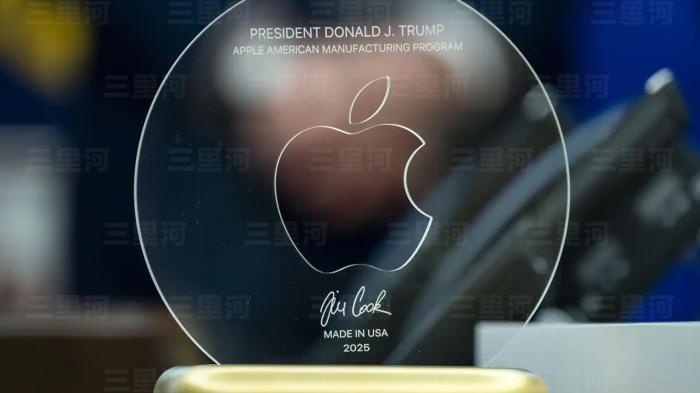 如,苹果公司首席执行官库克就向特朗普赠送了一件金光闪闪的“定制礼品”——刻着特朗普名字、苹果Logo和“美国制造”的玻璃摆件,并镶嵌在纯金底座上。同时,库克还承诺未来四年在美投资6000亿美元,迎合特朗普“iPhone美国造”的憧憬。