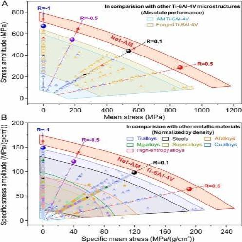 2024年初,研究团队发明一种净增材制造(Net-AM preparation,NAMP)的新工艺,能精确控制材料的内部结构和缺陷,用新工艺制备的Ti-6Al-4V(一种最常用的钛合金)可同时消除微孔和粗大组织——两者都是导致疲劳的元凶。这种新材料在循环“拉-拉”应力条件下,打破了“比疲劳强度”(强度除以密度,是衡量轻质材料性能的关键指标)世界纪录,证明3D打印材料也能拥有顶级的抗疲劳能力。