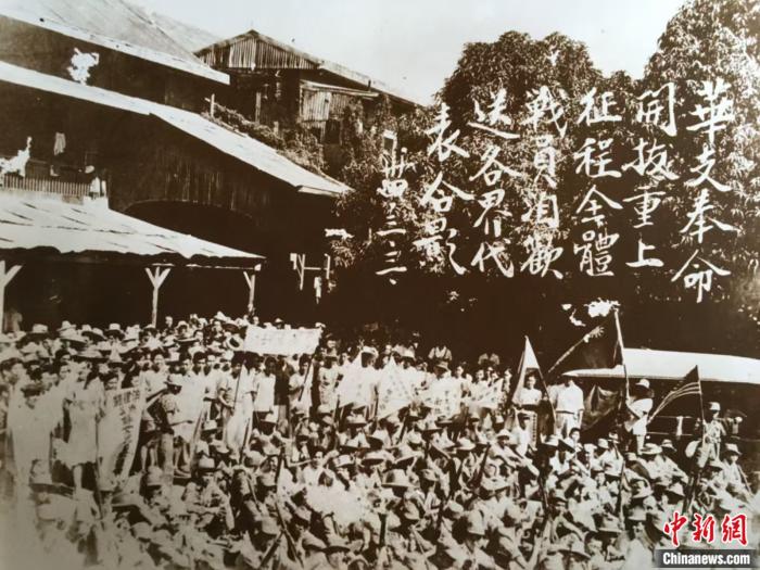 紧接着,“华支”准备配合盟军南征追歼日军。同年3月3日,华侨各界人士举行欢送“华支”出征仪式,场面壮观。华侨群众衣着整齐,高举旗帜,还有欢送横幅,站立于上方。“华支”战士身着军服,肩扛枪支,席地而坐。拍摄此场景的照片右上方,有如下题字:“华支奉命开拔重上征程,全体战员洎欢送各界代表合影。”